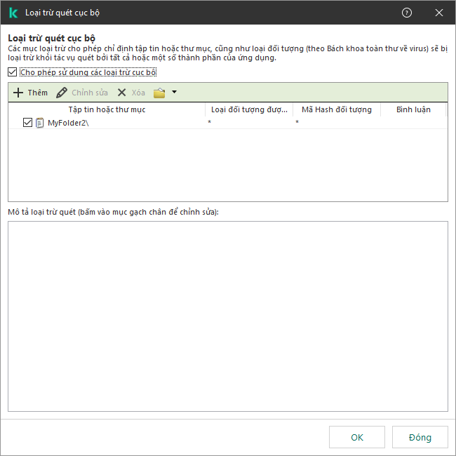 Nếu quản trị viên cho phép tạo vùng cục bộ được tin tưởng thì người dùng có thể thêm loại trừ quét của riêng họ và ứng dụng được tin tưởng trong giao diện người dùng của ứng dụng. Đồng thời, người dùng không có quyền sửa đổi hoặc xóa các đối tượng khỏi vùng được tin tưởng được cấu hình trong chính sách. Quản trị viên cũng có thể xem, thêm, sửa đổi hoặc xóa các mục danh sách trong bảng điều khiển Kaspersky Security Center nếu cần thêm các tùy chọn loại trừ cho một máy tính riêng rẽ.