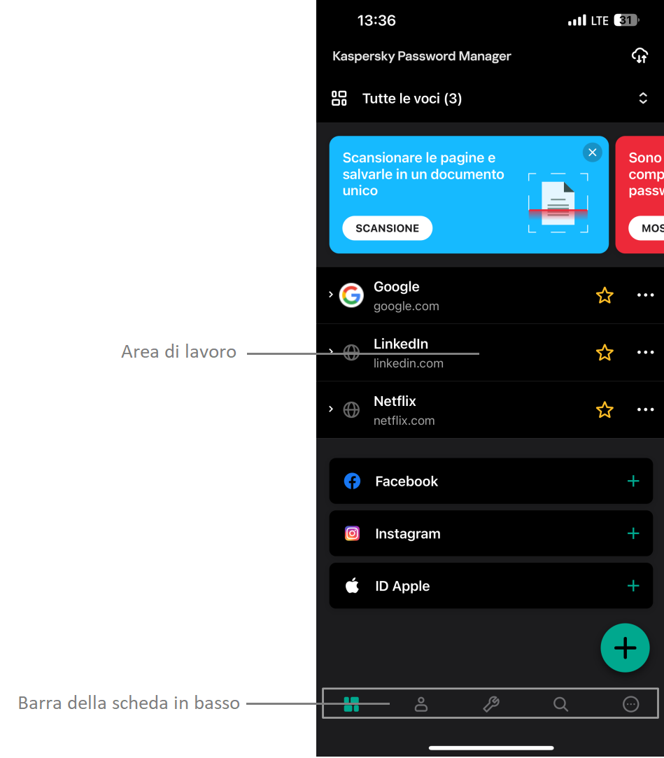 La finestra principale dell'app comprende la barra della scheda in basso e l'area di lavoro (vedere l'immagine di seguito). La barra della scheda in basso consente l'accesso rapido alle funzionalità e alle impostazioni di Kaspersky Password Manager.