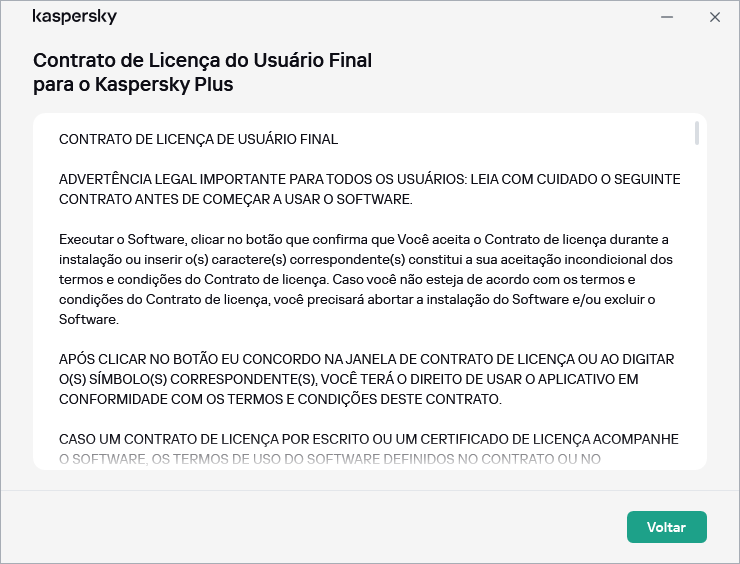 Em algumas versões do aplicativo, o Contrato de Licença do Usuário Final pode ser aberto clicando no link na tela de boas-vindas do Assistente. Nesse caso, apenas o botão Voltar está disponível na janela que contém o texto do Contrato de Licença do Usuário Final. Ao clicar no botão Continuar, você aceita os termos do Contrato de Licença do Usuário Final.