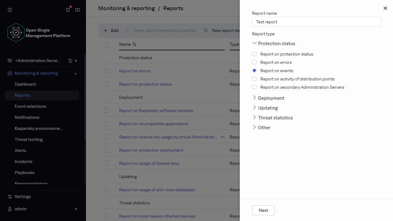 The New report template wizard starts. Proceed through the wizard by using the Next button.