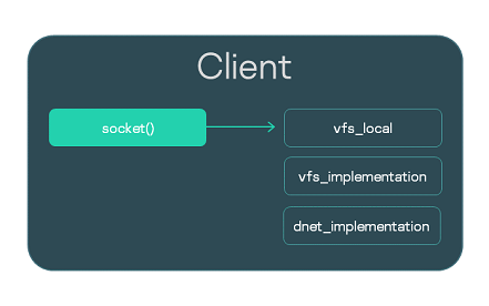 Рассмотрим программу Client, использующую сокеты Беркли. Вызовы, которые выполняет Client, должны направляться в VFS. Обычный путь состоит в запуске отдельного процесса VFS и создании IPC-канала. Однако вместо этого можно интегрировать функциональность VFS в сам исполняемый файл Client. Для этого нужно при сборке исполняемого файла Client скомпоновать его с библиотекой vfs_local, которая будет принимать вызовы, а также с библиотеками реализации – vfs_implementation и dnet_implementation.