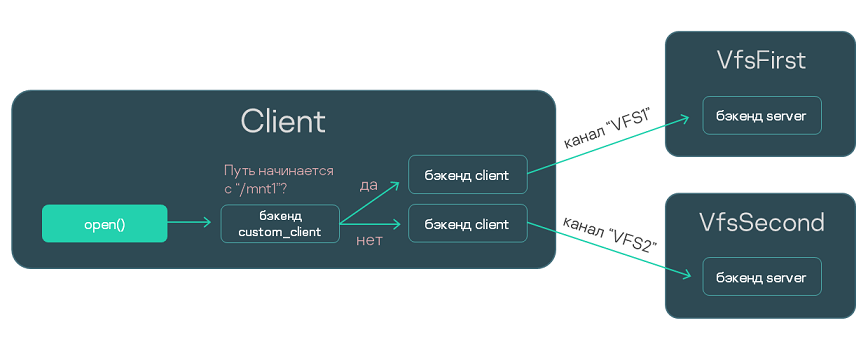 Мы напишем пользовательский бэкенд custom_client, который будет отправлять вызовы по каналу VFS1 или VFS2, в зависимости от того, начинается ли путь к файлу с /mnt1. Для отправки вызовов custom_client будет использовать стандартные бэкенды client, то есть будет являться проксирующим бэкендом.