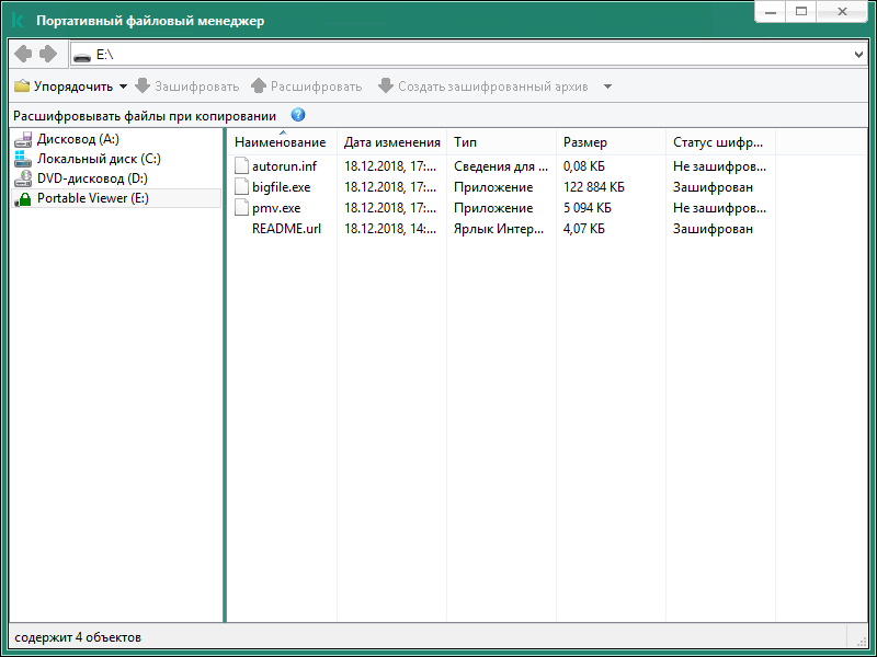 После шифрования файлов на съемном диске с поддержкой портативного режима доступны следующие способы доступа к файлам: