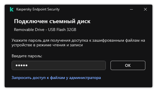 Вы можете изменить права доступа к съемному диску, даже если съемный диск подключен к компьютеру. Если права доступа к съемному диску изменились, Kaspersky Endpoint Security заблокирует доступ к файлам и запросит пароль повторно.