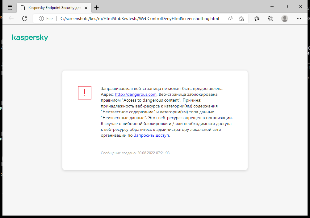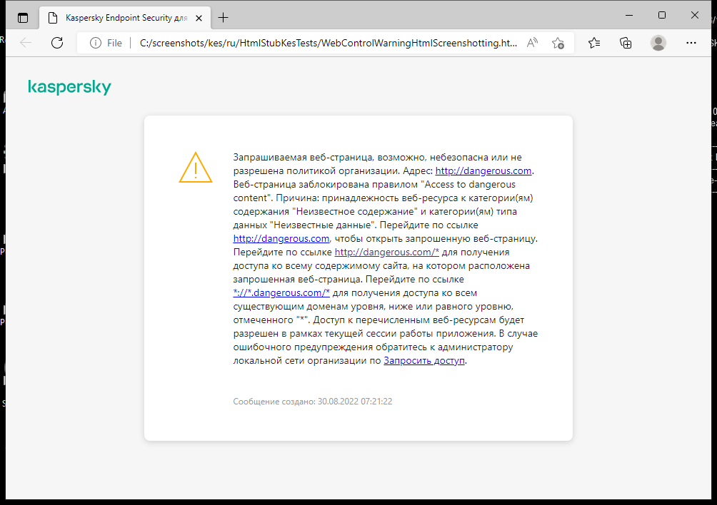 Веб-Контроль управляет доступом пользователей к веб-ресурсам. Это позволяет уменьшить расход трафика и сократить нецелевое использование рабочего времени. При попытке пользователя открыть веб-сайт, доступ к которому ограничен Веб-Контролем, Kaspersky Endpoint Security заблокирует доступ или покажет предупреждение (см. рис. ниже).
