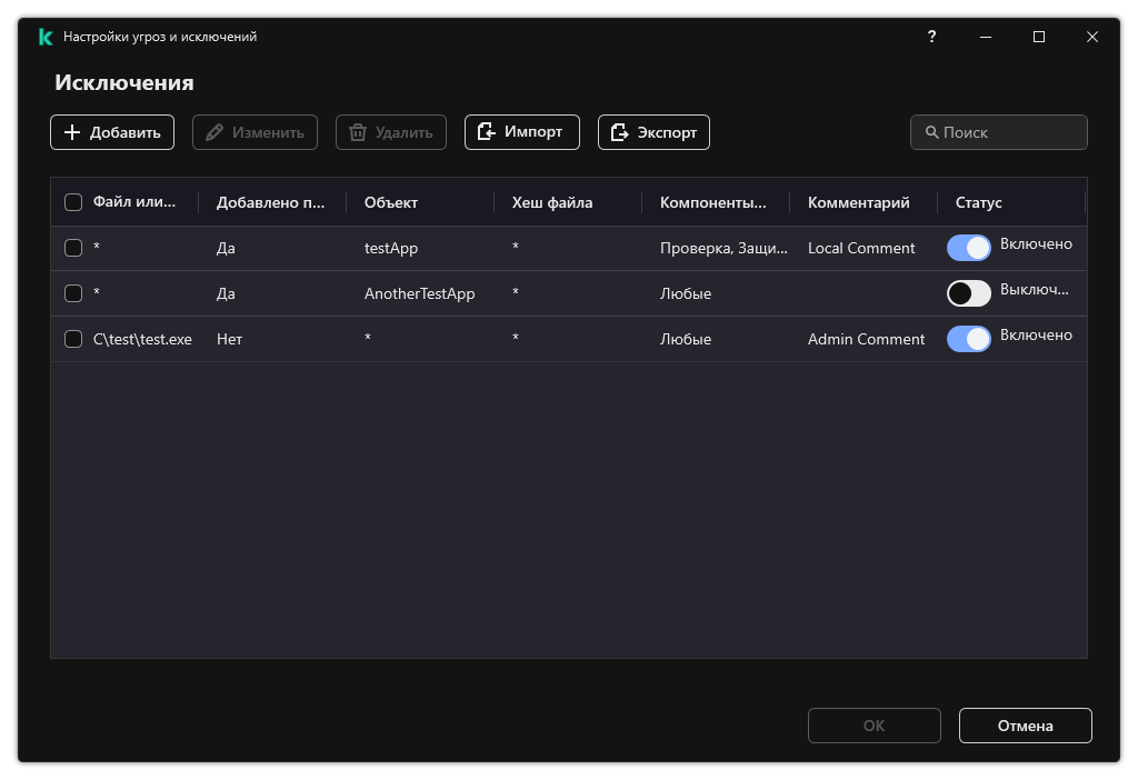 Исключения из проверки могут использоваться в ходе работы следующих компонентов и задач приложения, заданных администратором системы: