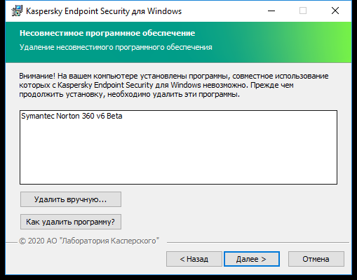 Если компьютер соответствует предъявляемым требованиям, мастер установки приложения выполняет поиск приложений "Лаборатории Касперского", одновременная работа которых может привести к возникновению конфликтов. Если такие приложения найдены, вам предлагается удалить их вручную.