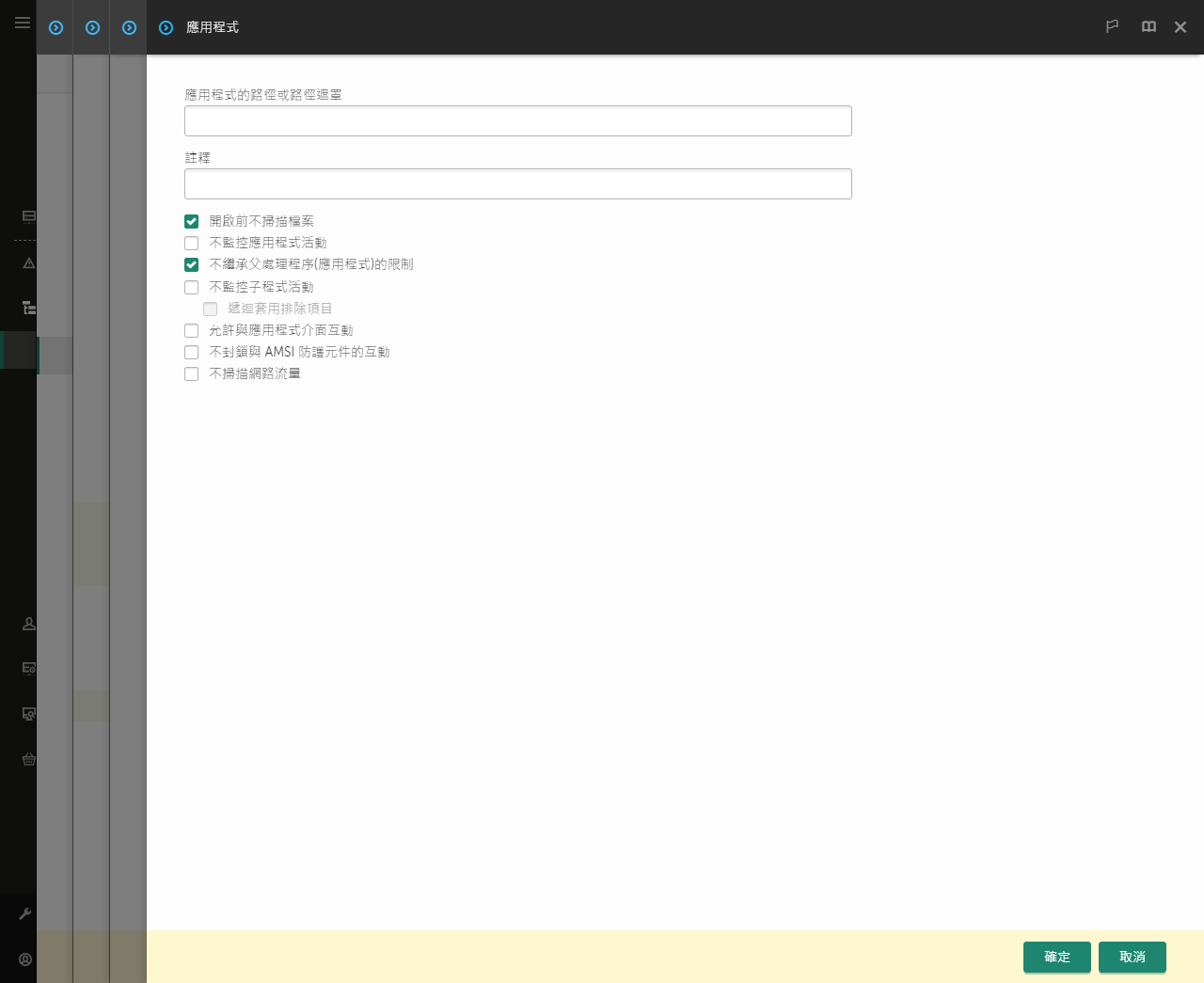 Kaspersky Endpoint Security 將不會監控該應用程式啟動的應用程式的檔案活動或網路活動。