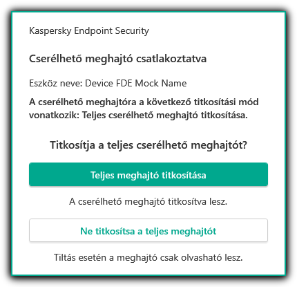 A rendszabály alkalmazása után, ha a felhasználó csatlakozik egy cserélhető meghajtóhoz, vagy egy cserélhető meghajtó már csatlakoztatva van, a Kaspersky Endpoint Security a felhasználó megerősítését kéri, hogy titkosítási műveletet végezzen el (lásd az alábbi ábrát).
