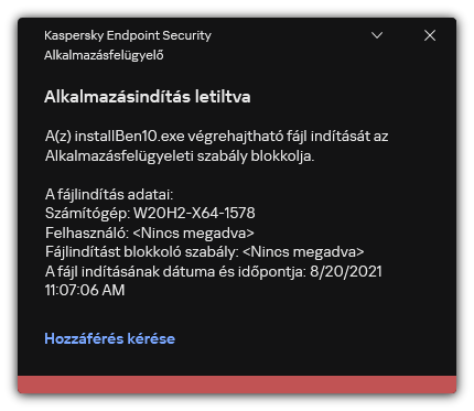 Ha egy felhasználó megpróbálja az Alkalmazásfelügyeleti szabályok által blokkolt valamelyik alkalmazást elindítani, a Kaspersky Endpoint Security megjelenít egy üzenetet arról, hogy az alkalmazás indítása blokkolva van. Ha a felhasználó úgy véli, hogy az alkalmazás indítása tévedésből van blokkolva, akkor az üzenet szövegében lévő hivatkozás segítségével üzenetet küldhet a helyi vállalati hálózati rendszergazdának.
