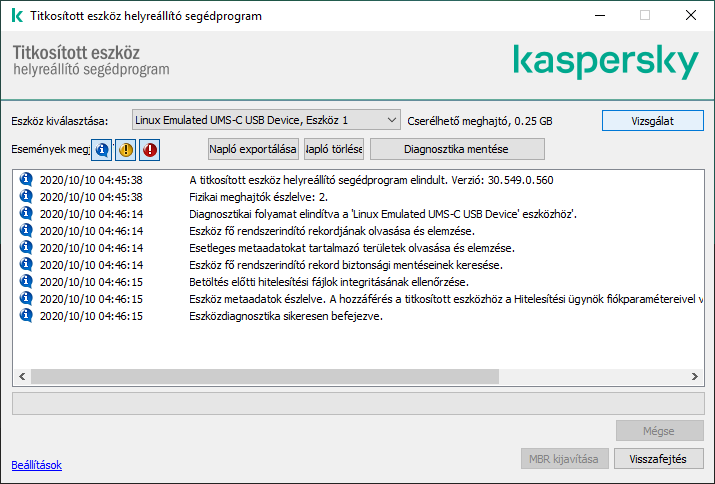 A Visszaállító segédprogram akkor kínálja fel az eszköz feloldását, ha a Kaspersky Endpoint Security titkosítási funkciója a számítógépen rendelkezésre áll. Noha az eszköz feloldásakor nem kerül sor visszafejtésre, a feloldás eredményeként közvetlenül hozzáférhetővé válik. Ha a Kaspersky Endpoint Security titkosítási funkciójához a számítógép nem fér hozzá, a Visszaállító segédprogram felkínálja az eszköz visszafejtését.