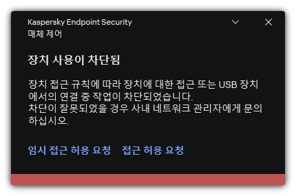 매체 제어로 차단된 장치가 컴퓨터에 연결되면 Kaspersky Endpoint Security가 접근을 차단하고 알림을 표시합니다(아래 그림 참조).