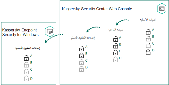 ونتيجة لذلك سيتم تكوين الإعدادات الخاصة بـ Kaspersky Endpoint على أجهزة الكمبيوتر العميلة أثناء المزامنة التالية. يمكنك عرض معلومات حول السياسة المطبقة على الكمبيوتر في واجهة Kaspersky Endpoint Security من خلال النقر على الزر