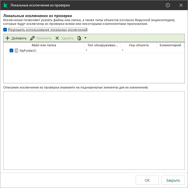 Если необходимо, в поле Комментарий введите краткий комментарий к создаваемому исключению из проверки.