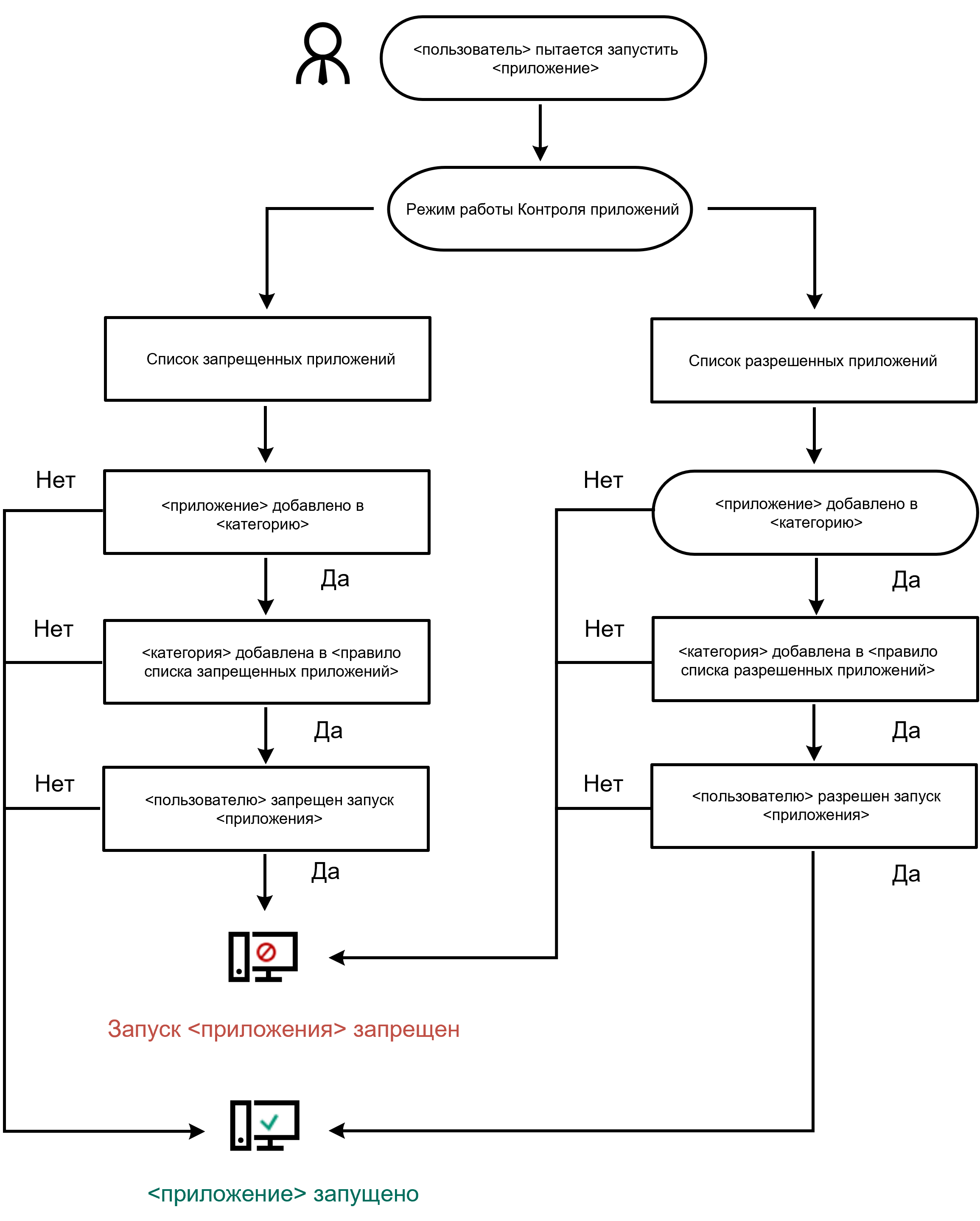 Kaspersky Endpoint Security использует алгоритм для принятия решения о запуске приложения (см. рис. ниже).