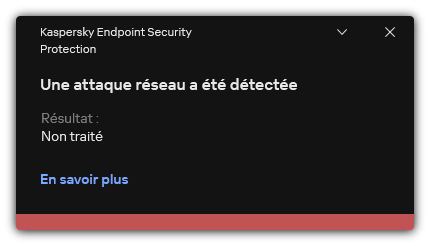 Par conséquent, lorsque Kaspersky Endpoint Security détecte une tentative d'attaque réseau lancée contre l'ordinateur de l'utilisateur, il bloque toutes les connexions issues de l'ordinateur attaquant. Kaspersky Endpoint Security crée l'événement Une attaque réseau a été détectée. L'événement contient des informations à propos de l'ordinateur attaquant : adresses IP et MAC.