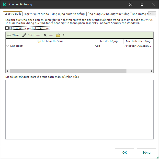 Nếu quản trị viên cho phép tạo vùng cục bộ được tin tưởng thì người dùng có thể thêm loại trừ quét của riêng họ và ứng dụng được tin tưởng trong giao diện người dùng của ứng dụng. Đồng thời, người dùng không có quyền sửa đổi hoặc xóa các đối tượng khỏi vùng được tin tưởng được cấu hình trong chính sách. Quản trị viên cũng có thể xem, thêm, sửa đổi hoặc xóa các mục danh sách trong bảng điều khiển Kaspersky Security Center nếu cần thêm các tùy chọn loại trừ cho một máy tính riêng rẽ.