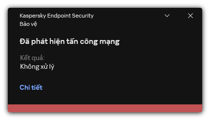Kết quả là khi Kaspersky Endpoint Security phát hiện một nỗ lực tấn công mạng được phát động nhắm vào máy tính của người dùng, ứng dụng sẽ chặn tất cả các kết nối mạng với máy tính tấn công. Kaspersky Endpoint Security sẽ tạo sự kiện Network attack detected. Sự kiện chứa thông tin về máy tính tấn công: địa chỉ IP và MAC.