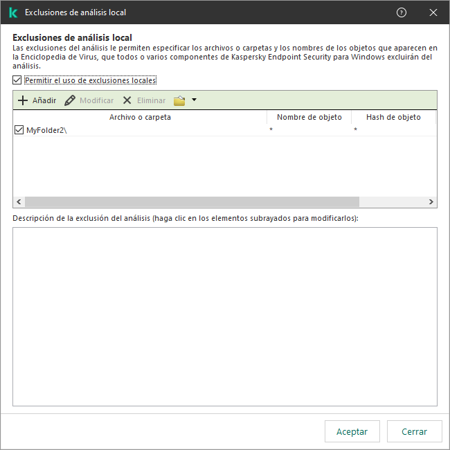 Se abre una ventana que contiene una lista de exclusiones locales.