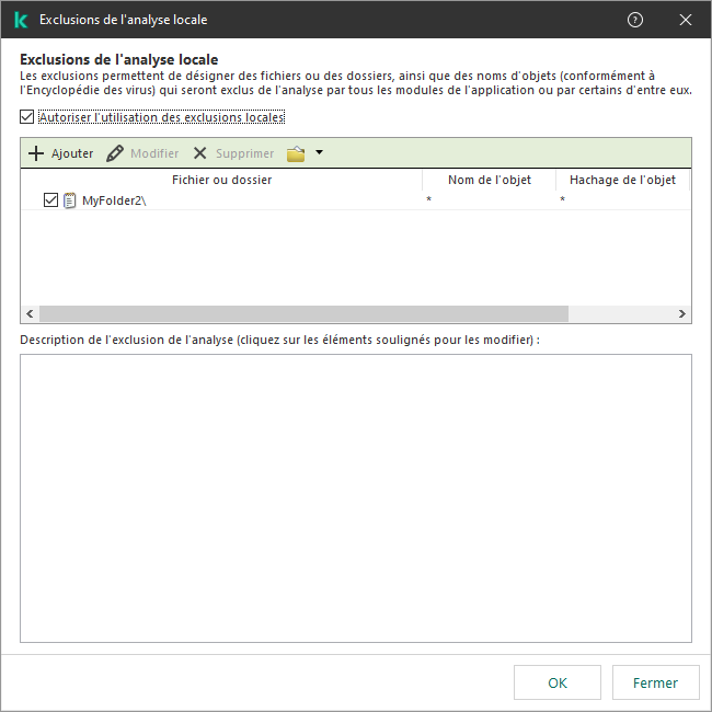 Si la création d'une zone de confiance locale est autorisée par un administrateur, l'utilisateur peut ajouter ses propres exclusions d'analyse et applications de confiance dans l'interface utilisateur de l'application. Dans le même temps, l'utilisateur ne dispose pas des autorisations nécessaires pour modifier ou supprimer des objets de la zone de confiance configurée dans la stratégie. L'administrateur peut également afficher, ajouter, modifier ou supprimer des éléments de liste dans la console Kaspersky Security Center si des exclusions doivent être ajoutées pour un ordinateur individuel.