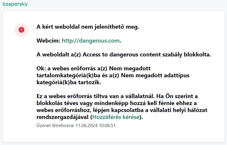 Figyelmeztető üzenet. Ez az üzenet figyelmezteti a felhasználót, hogy a webes erőforrást nem ajánlott felkeresni és / vagy ellentétes a vállalati biztonsági szabályzattal. A Kaspersky Endpoint Security akkor jelenít meg figyelmeztető üzenetet, ha a Figyelmeztetés lehetőség van kiválasztva a webes erőforrást leíró szabály beállításaiban.