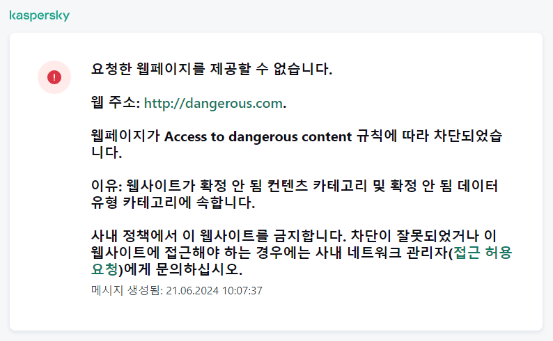 경고 메시지. 이 메시지는 해당 웹 리소스를 방문하는 사용자에게 권장하지 않거나 또는 기업 보안 정책을 위반하는 것이라고 경고합니다. Kaspersky Endpoint Security는 해당 웹 리소스를 설명하는 규칙 설정에서 경고 옵션을 선택하면 경고 메시지를 표시합니다.