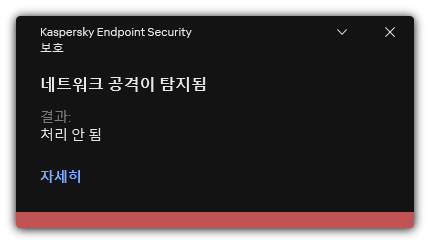 결과적으로 Kaspersky Endpoint Security는 사용자 컴퓨터에 대한 네트워크 공격 시도를 탐지하면 공격 컴퓨터와의 모든 연결을 차단합니다. Kaspersky Endpoint Security에서 네트워크 공격 탐지 이벤트를 띄웁니다. 이벤트에는 공격을 시도한 컴퓨터의 정보(IP 및 MAC 주소)가 포함됩니다.