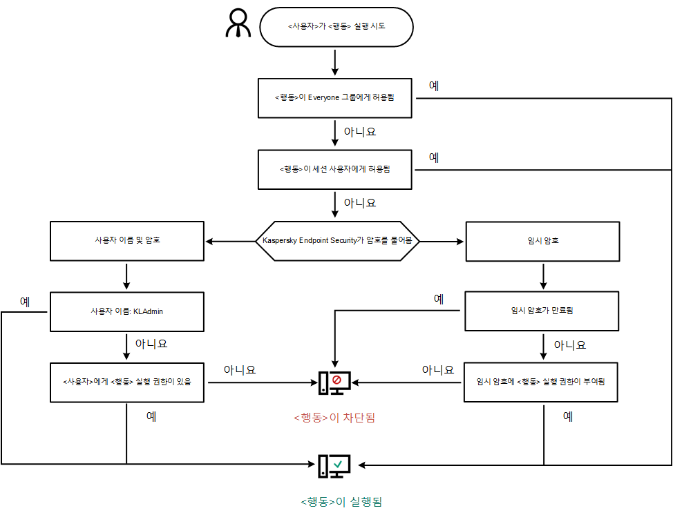 Kaspersky Endpoint Security는 다음 알고리즘에 따라 암호로 보호된 동작을 허용할지 또는 차단할지 결정합니다(아래 그림 참조).