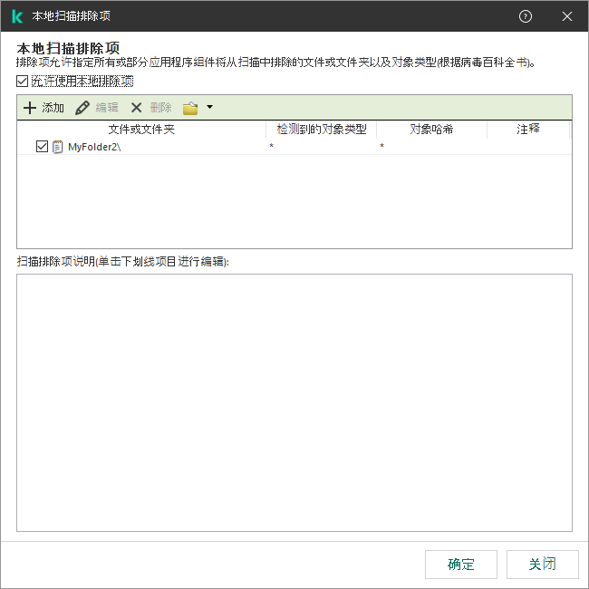 Email-Worm、Rootkit或RemoteAdmin)。您可以使用带有 ? 字符(取代单个字符)和 * 字符(取代任意数量字符)的掩码。例如,如果 Client* 掩码被指定,Kaspersky Endpoint Security 从扫描中排除 Client-IRC、Client-P2P 和 Client-SMTP 对象。