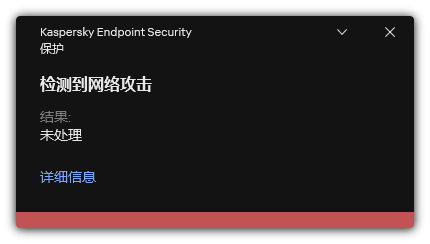 结果,当 Kaspersky Endpoint Security 检测到针对用户计算机的网络攻击企图时,它将阻止与攻击计算机的网络连接。Kaspersky Endpoint Security 创建“检测到网络攻击”事件。事件包含有关攻击计算机的信息:IP 和 MAC 地址。