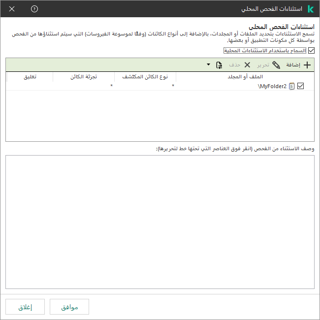 ستتم إضافة الاستثناء الجديد إلى القائمة. ويمكنك تعطيل الاستثناء في أي وقت باستخدام خانة الاختيار الموجودة في عمود الحالة.