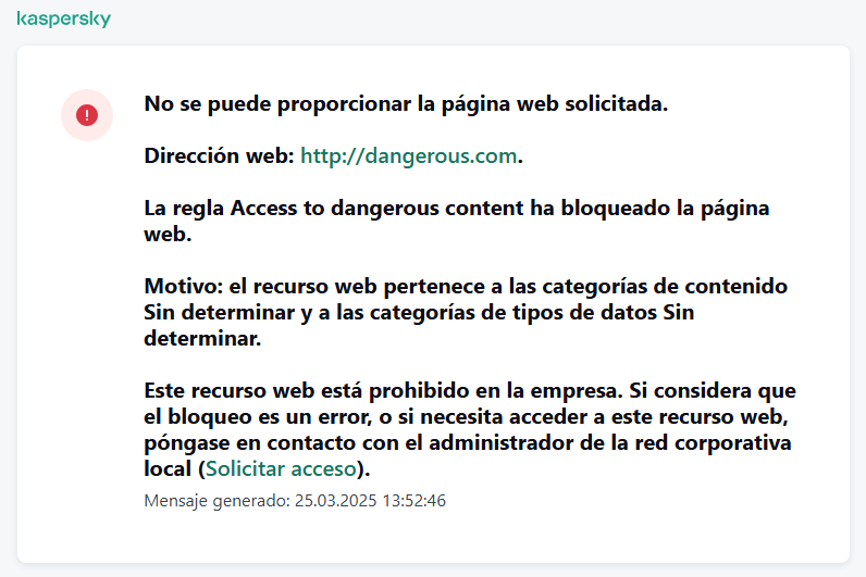 Mensaje al administrador. La plantilla del mensaje que se enviará al administrador de la LAN si el usuario considera que el bloqueo es un error. Después de que el usuario solicite acceso, Kaspersky Endpoint Security envía un evento a Kaspersky Security Center: Mensaje al administrador por bloqueo del acceso a la página web. La descripción del evento contiene un mensaje para el administrador con variables sustituidas. Puede ver estos eventos en la consola de Kaspersky Security Center usando la selección de eventos predefinida Solicitudes de los usuarios. Si su organización no tiene implementado Kaspersky Security Center o no hay conexión con el Servidor de administración, la aplicación enviará un mensaje al administrador a la dirección de correo electrónico especificada.