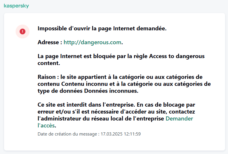 Si l'utilisateur considère que l'accès à la ressource Internet a été bloqué par erreur, il peut cliquer sur le lien dans le corps du message de blocage du site Internet pour envoyer un message prérédigé destiné à l'administrateur du réseau local d'entreprise.