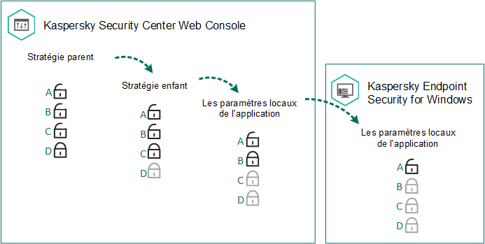 fonctionne uniquement seulement si l'héritage des paramètres de la stratégie parent est activé dans la stratégie enfant. Les stratégies pour les utilisateurs autonomes ne fonctionnent pas selon la hiérarchie des groupes d'administration sur d'autres stratégies.