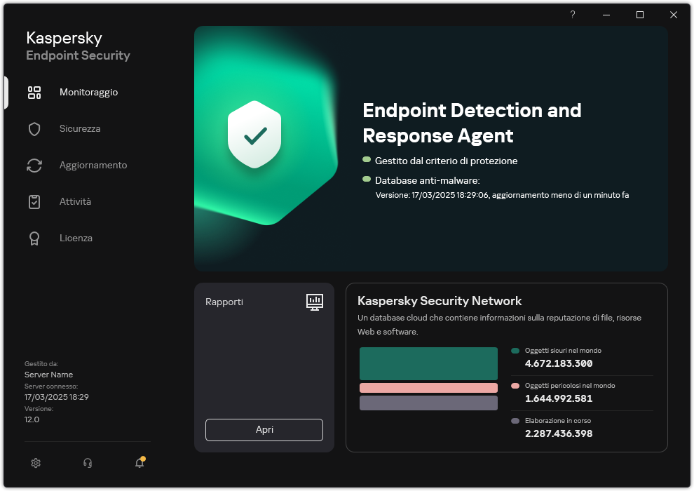 Di conseguenza, nel computer viene installata l'applicazione EDR Agent per l'integrazione con Kaspersky Anti Targeted Attack Platform (EDR). È possibile verificare che l'applicazione sia installata e controllare le impostazioni dell'applicazione eseguendo il comando status.