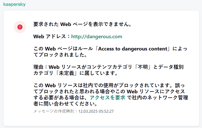 管理者に送信するメッセージ:メッセージのテンプレートには、ブロックが誤検知だと考えられる場合に LAN 管理者に送信するメッセージのテンプレートが含まれています。ユーザーがアクセス権を要求した後、Kaspersky Endpoint Security は Kaspersky Security Center にイベントを送信します:Web ページへのアクセスブロックに関するメッセージが管理者に送信されました。このイベントの説明には、代用変数を含む管理者へのメッセージが含まれます。これらのイベントは、事前定義されたイベント抽出[ユーザー要求]を使用して Kaspersky Security Center コンソールで確認できます。組織で Kaspersky Security Center が導入されていない、または管理サーバーに接続されていない場合は、本製品は指定されたメールアドレスの管理者にメッセージを送信します。
