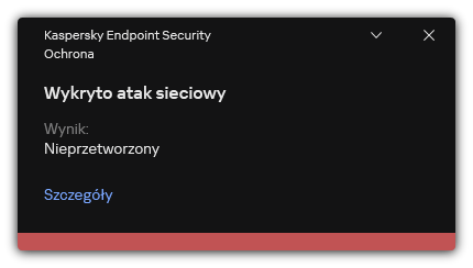 W wyniku tego działania, jeśli Kaspersky Endpoint Security wykryje próbę ataku sieciowego skierowanego na komputer użytkownika, zablokuje wszelkie połączenia z atakującym komputerem. Kaspersky Endpoint Security tworzy zdarzenie Wykryto atak sieciowy. Zdarzenie zawiera informacje o atakującym komputerze: adresy IP i MAC.