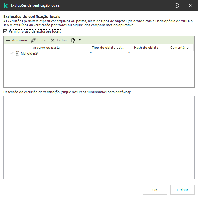 Nova exclusão. O Kaspersky Endpoint Security adiciona uma nova exclusão de verificação à raiz da lista.