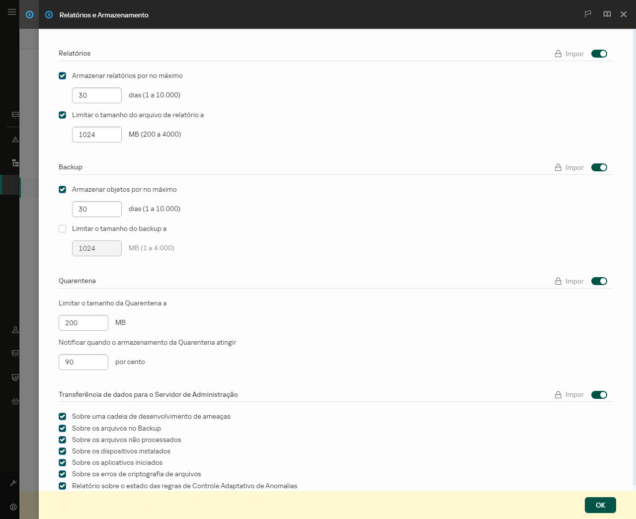 Para manter o banco de dados dos aplicativos instalados atualizado, o envio de informações do aplicativo ao Servidor de Administração deve estar ativado (ativado por padrão).