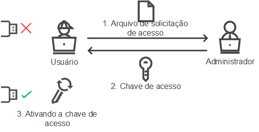 Se você precisar conceder acesso temporário a um dispositivo bloqueado, mas não puder adicionar o dispositivo à lista confiável, você pode conceder acesso ao dispositivo no modo offline. Dessa forma, você pode conceder acesso a um dispositivo bloqueado mesmo se o computador não tiver acesso à rede ou se o computador estiver fora da rede corporativa.