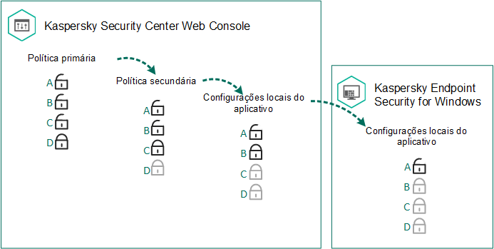 Uma política é um conjunto de configurações do aplicativo definidas para um grupo de administração. Você pode configurar várias políticas com valores diferentes para um aplicativo. Um aplicativo pode ser executado em diferentes configurações para diferentes grupos de administração. Cada grupo de administração pode ter a sua própria política para um aplicativo.