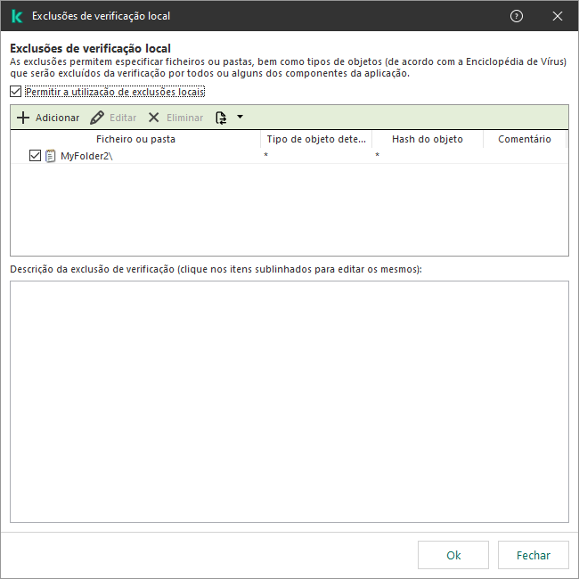 O Kaspersky Endpoint Security oculta a lista de exclusões de verificação na interface de utilizador da aplicação se a configuração de exclusões de verificação for bloqueada pelo administrador na consola (símbolo de "cadeado fechado") e se as exclusões de verificação locais forem proibidas (a caixa de verificação Permitir a utilização de exclusões locais está desmarcada).