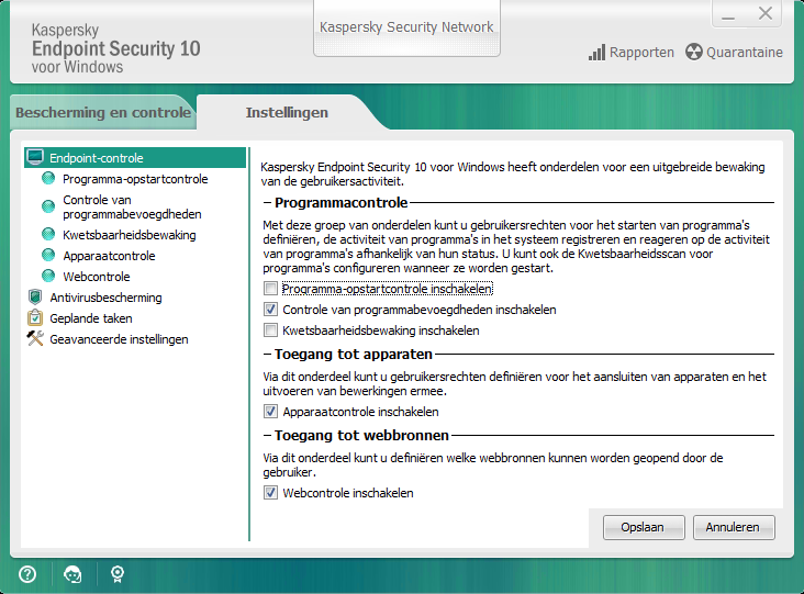 Op het tabblad met instellingen van Kaspersky Endpoint Security kunt u algemene programma-instellingen, individuele onderdelen, rapporten en opslag, scantaken, updatetaken, kwetsbaarheidsscans en de communicatie met Kaspersky Security Network-servers configureren.
