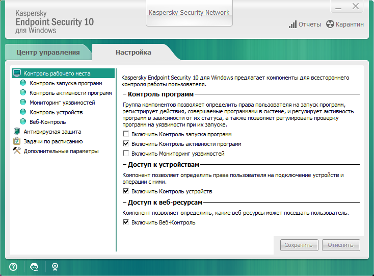Закладка настройки параметров Kaspersky Endpoint Security предназначена для настройки параметров работы программы в целом, отдельных ее компонентов, отчетов и хранилищ, задач проверки, задачи обновления и задачи поиска уязвимостей, а также для настройки связи с серверами Kaspersky Security Network.