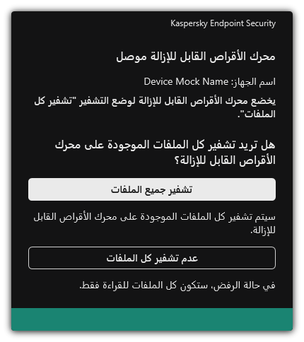 بعد تطبيق السياسة، عندما يقوم المستخدم بتوصيل محرك أقراص قابل للإزالة أو إذا كان محرك أقراص قابل للإزالة متصلاً بالفعل، يطالب برنامج Kaspersky Endpoint Security المستخدم بتأكيد إجراء عملية التشفير (انظر الشكل أدناه).