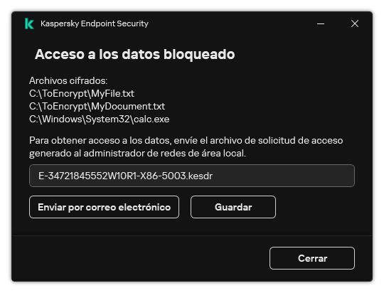 Kaspersky Endpoint Security genera un archivo de solicitud de acceso para acceder a todos los archivos cifrados almacenados en la unidad del equipo (unidad local o extraíble).