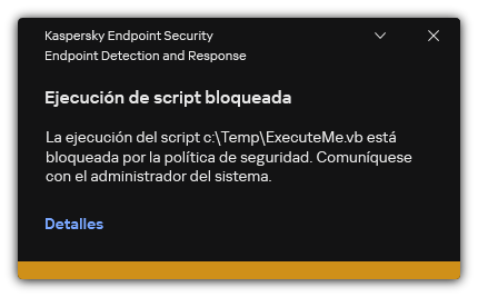 Como resultado, Kaspersky Endpoint Security bloquea la ejecución de objetos: ejecución de archivos ejecutables y scripts, apertura de archivos de formato Office. Sin embargo, puede abrir un archivo de script en un editor de textos, incluso si no se puede ejecutar el script. Cuando se bloquea la ejecución de un objeto, Kaspersky Endpoint Security muestra una notificación estándar (ver la figura a continuación), si las notificaciones están habilitadas en la configuración de la aplicación.