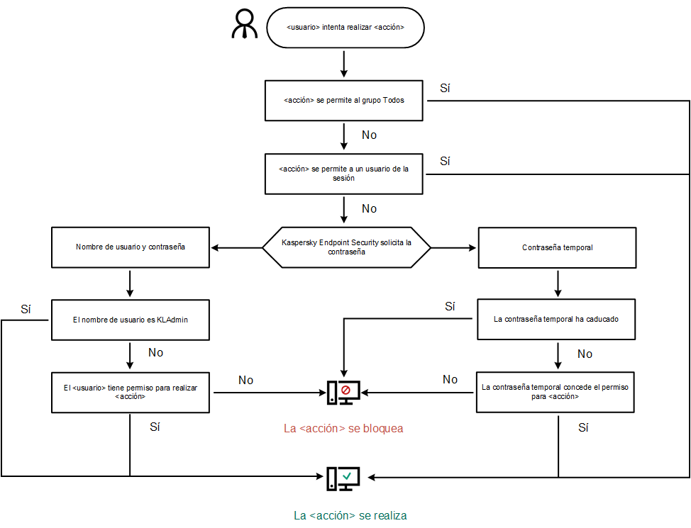 Kaspersky Endpoint Security decide si se autoriza o se bloquea una acción protegida con contraseña de acuerdo al siguiente algoritmo (consulte la siguiente figura).