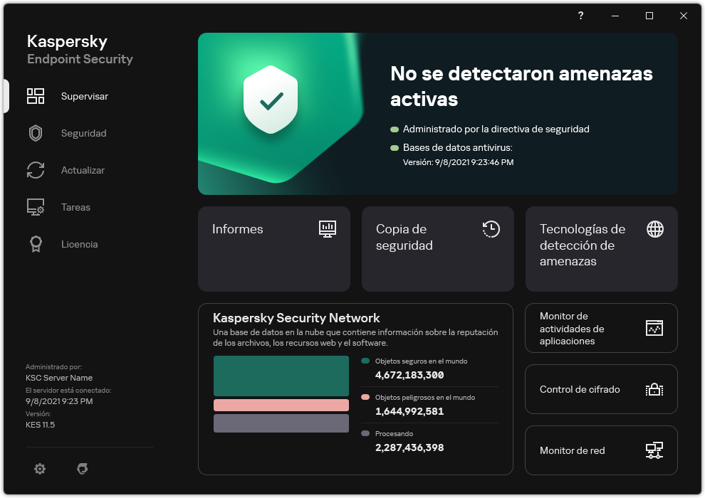 Kaspersky Security Network. Estado de la conexión entre Kaspersky Endpoint Security y Kaspersky Security Network, y estadísticas de KSN Global. Kaspersky Security Network (KSN) es una infraestructura de servicios en la nube que brinda acceso a la Base de conocimientos de Kaspersky, un recurso en línea que permite conocer la reputación de los archivos, los recursos web y el software. El uso de los datos de Kaspersky Security Network garantiza respuestas más rápidas de Kaspersky Endpoint Security ante las amenazas nuevas, mejora el rendimiento de algunos componentes de protección y reduce la probabilidad de falsos positivos. Si participa en Kaspersky Security Network, Kaspersky Endpoint Security podrá utilizar los servicios de KSN para conocer la categoría y la reputación de los archivos analizados u obtener información sobre la reputación de las direcciones web que se analicen.