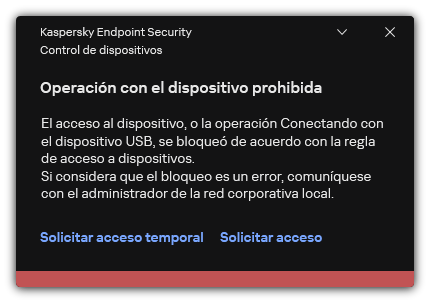 Cuando se conecta al equipo un dispositivo que está bloqueado por el Control de dispositivos, Kaspersky Endpoint Security bloqueará el acceso y mostrará que una notificación (consulte la figura a continuación).
